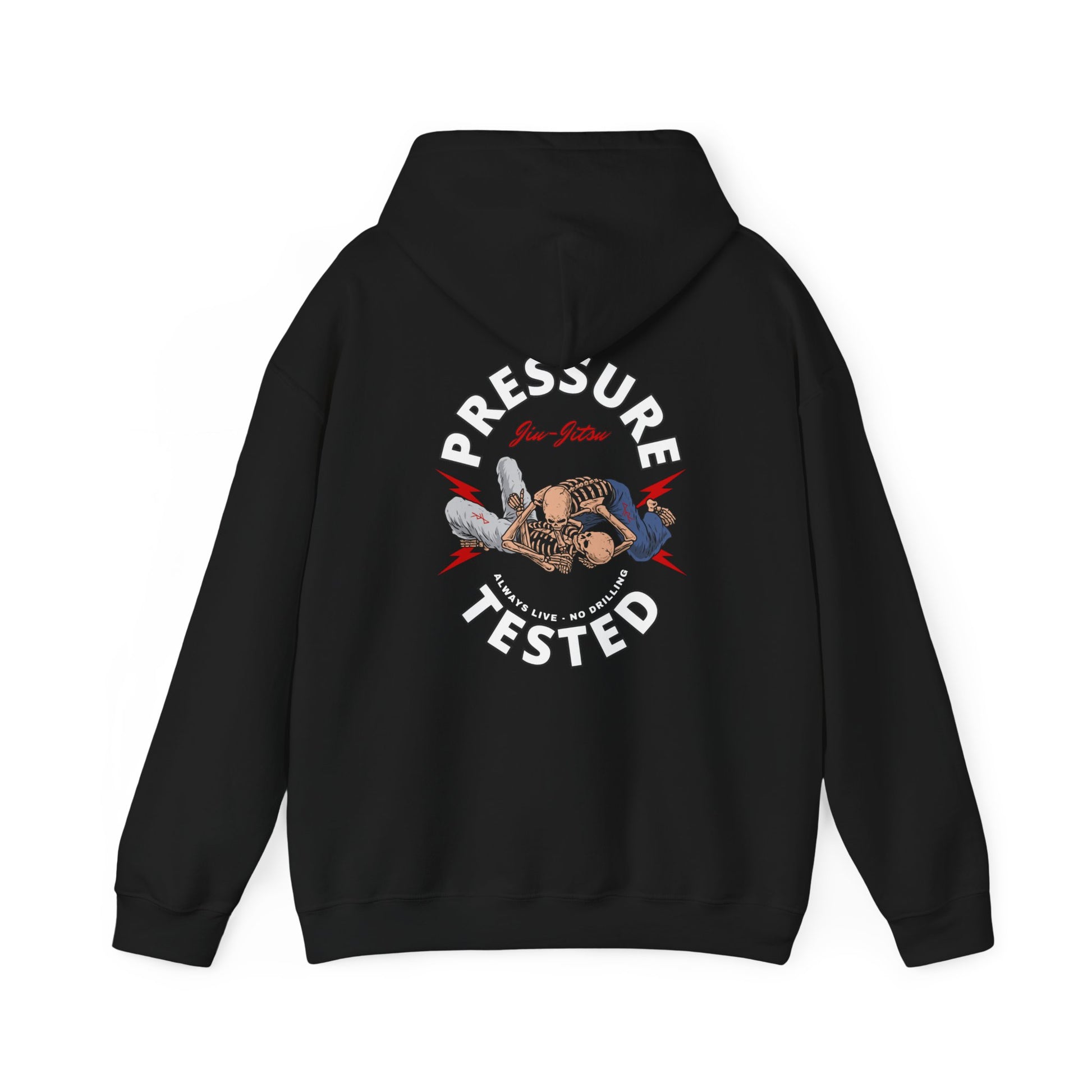 Featuring an intense grappler locked in combat, it symbolizes the real-life battles fought and the hard-earned victories of live training — No Drilling needed. (Shout out to the ecological dynamics crowd!) The bold lettering "PRESSURE TESTED" arcs over the dynamic illustration, affirming the wearer's dedication to being tried and true in the face of adversity.